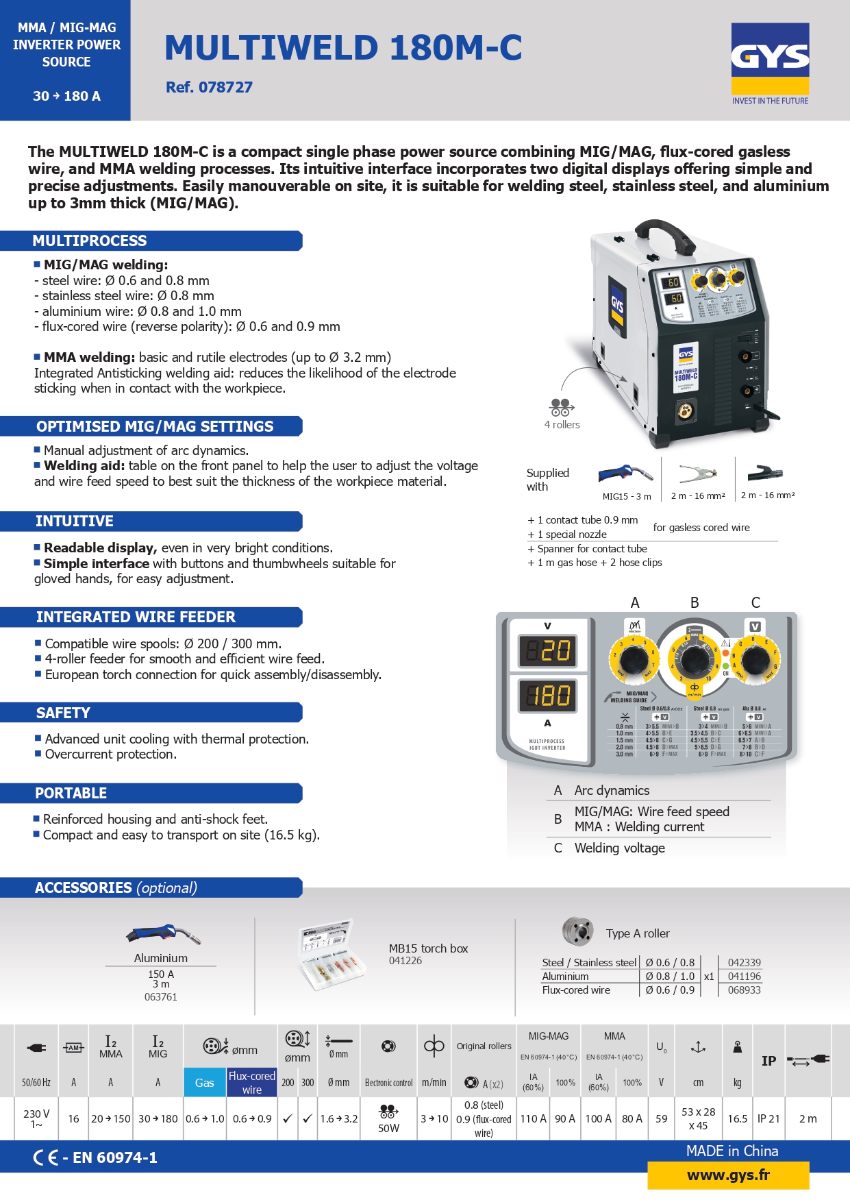 The MULTIWELD 180M-C is a compact, single-phase power source combining MIG/MAG, flux-cored wire and MMA welding processes. Its intuitive interface incorporates two digital displays for simple, precise settings. Easy to transport on site, it is recommended for welding steel, stainless steel and aluminium up to 3 mm thick (MIG/MAG).