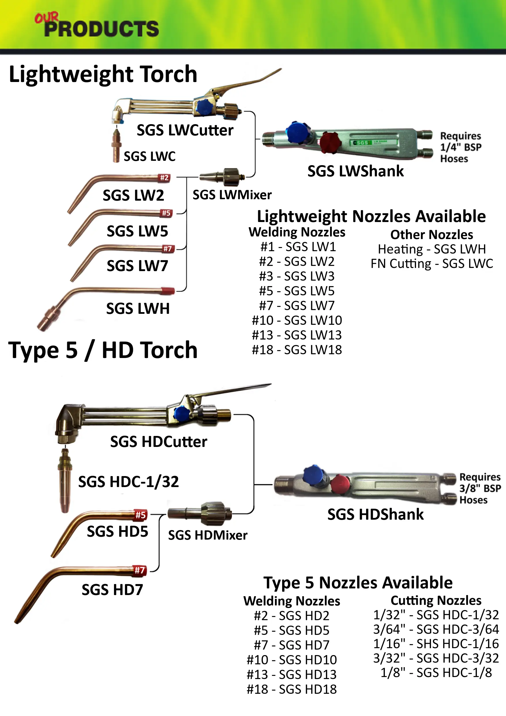 The SGS heavy duty cutting nozzles fit onto the heavy duty Cutting attachment, There is an array of sizes with the larger sizes designed for thicker material.